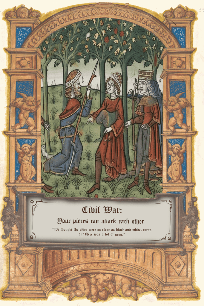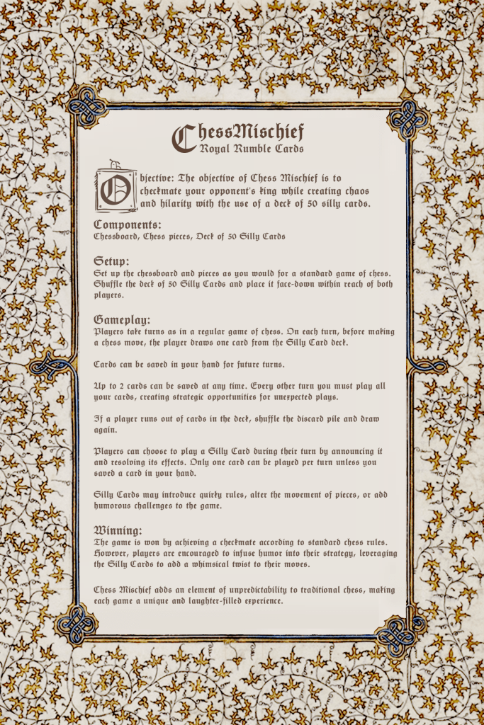 Chess Mischief is a comedic add-on to the traditional chess game that adds the randomness to the game. Draw a card and see how the silly world of the medieval age interferes with the best laid plans.