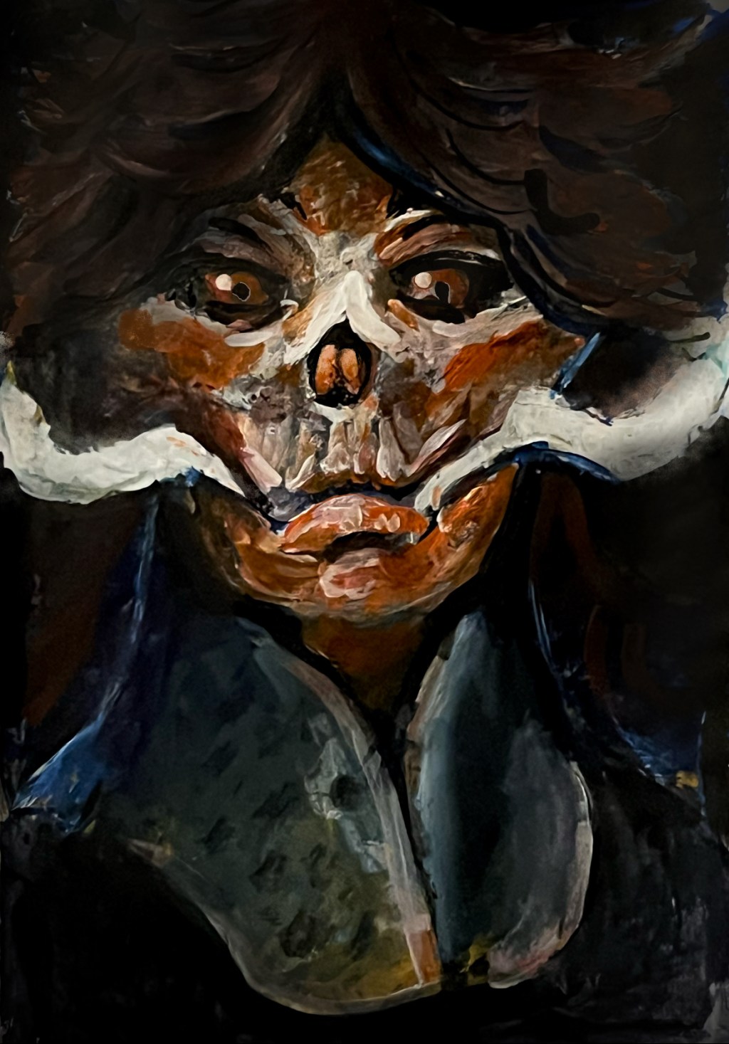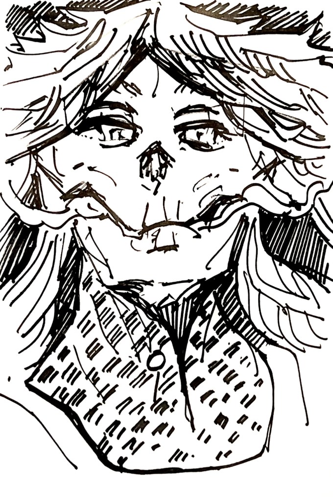 A combination of sharpie, acrylic paint, and digital paint. This portrait was made as it was being drawn in alla prima, with ink and without reference. Keeping loose and reactive allows new opportunities to be discovered in both shape and color design.