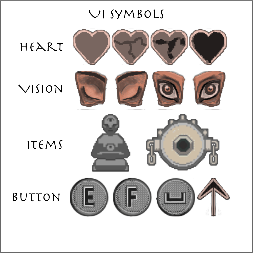 I made pixelated UI art that simulated red ochre, charcoal, and chalk. This gives an old world and Hellenic theme to the game.